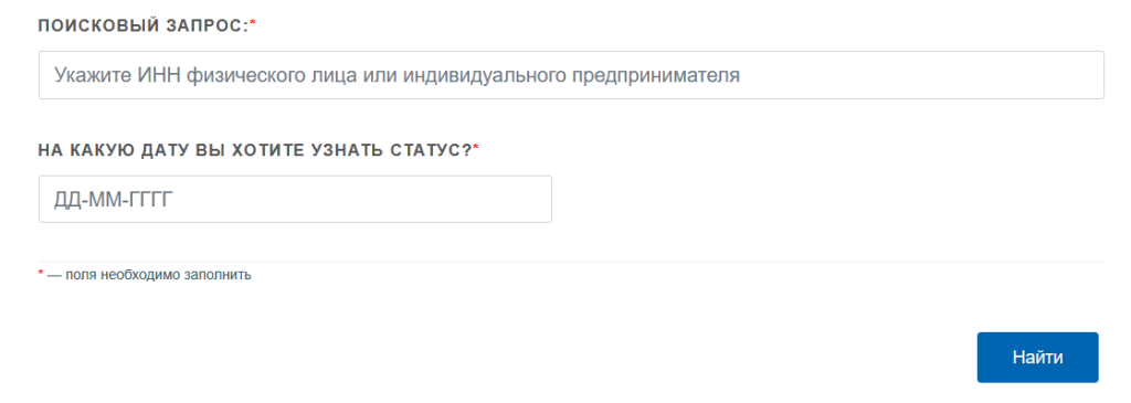 Прежде чем оплачивать услуги СЗ, важно убедиться, что у вашего исполнителя действительно имеется соответствующий статус. Для этого переходим в онлайн-сервис ФНС, в поля для запроса указываем ФИО исполнителя, ниже – дату, на которую хотите узнать его статус.
