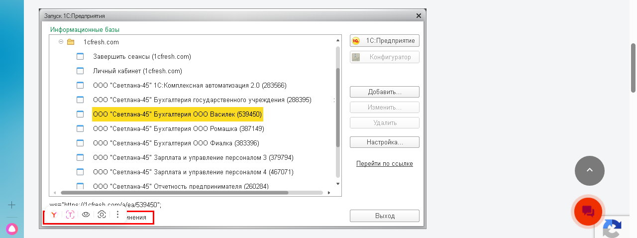 - В списке баз в окошке «Запуск 1С:Предприятия» выберите нужную информационную базу.