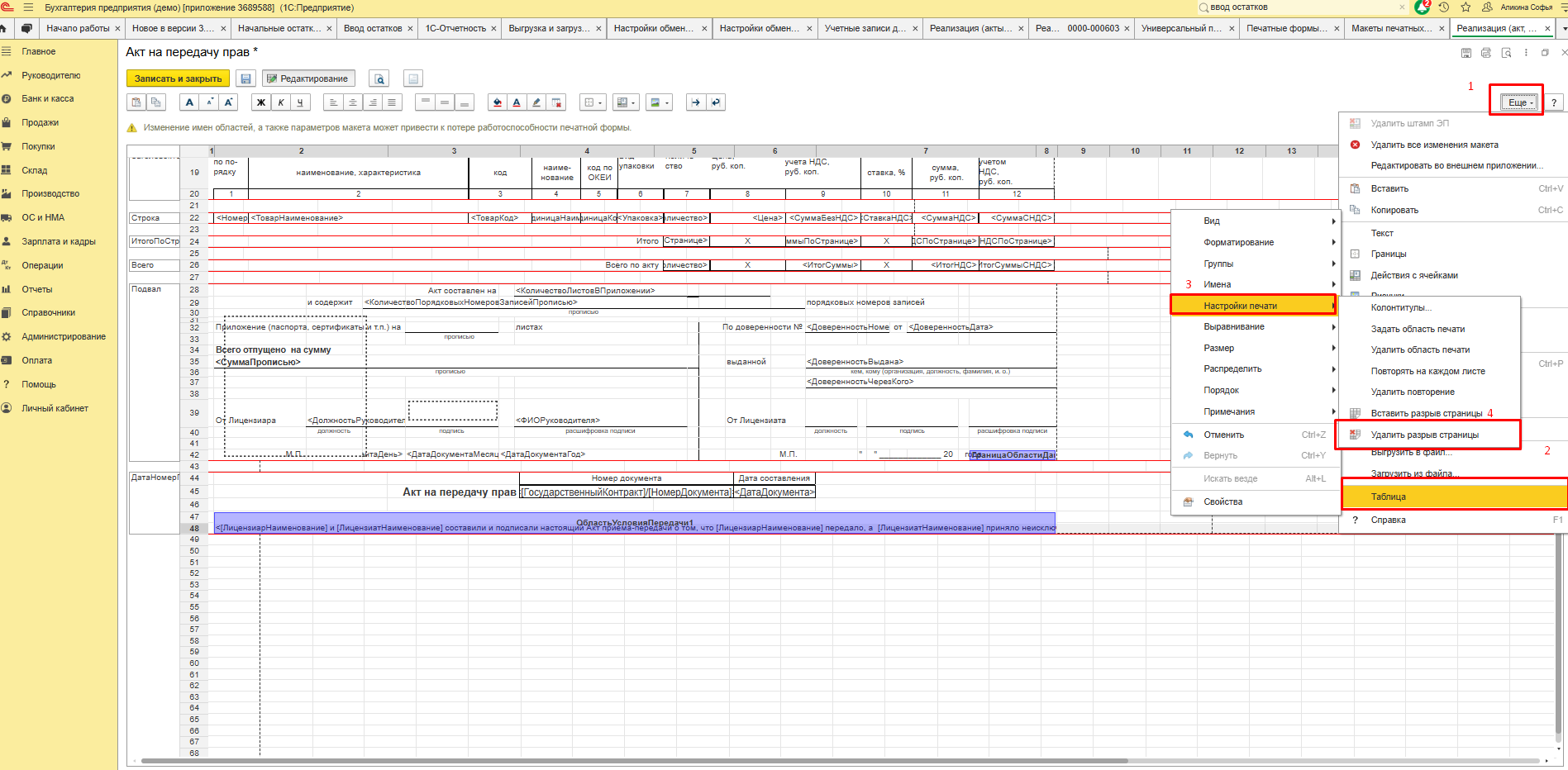 Система 1С автоматически определяет расположение данных на странице. При превышении объема информации или несоответствии параметров страницы, программа добавляет разрыв, отображаемый пунктирной линией.
