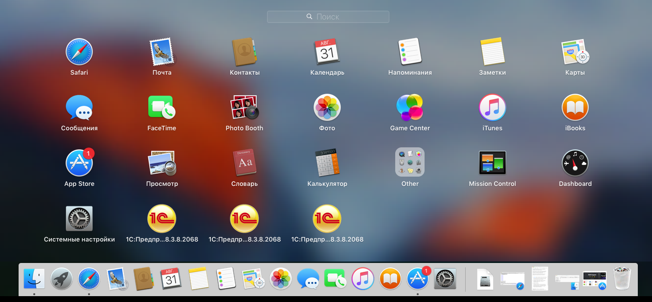 Теперь в панели Launchpad появятся иконки 1С:Предприятие 8, а также толстого и тонкого клиентов 1C. Можно оставить только ту, которой будете пользоваться, а ненужные удалить (при необходимости их можно будет восстановить).