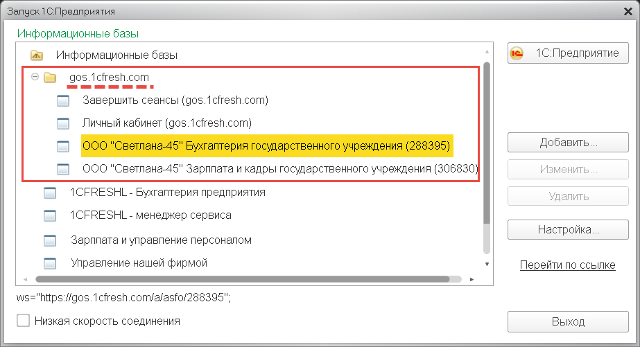 И отображение списка баз в виде дерева: для этого в тонком клиенте нужно перейти в Настройку и там отметить Отображать в виде дерева – в результате сформируется группа «веток», где отражаются подключенные приложения сервиса, вход в Личный кабинет, команда для завершения сеансов – после ее выполнения, когда будете входить в следующий раз, потребуются логин и пароль.