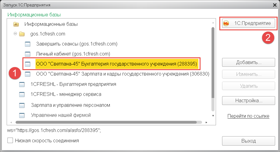 - В окне запуска отметьте приложение, которое хотите открыть – и кликните по кнопке 1С:Предприятие.