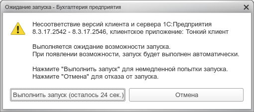 Если версии платформы и тонкого клиента разные, сервис выдаст сообщение о несоответствии: