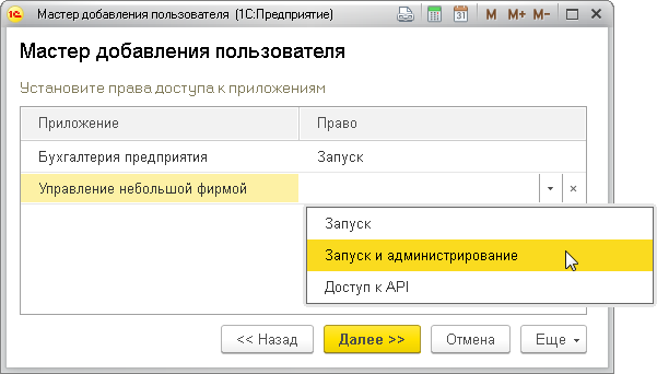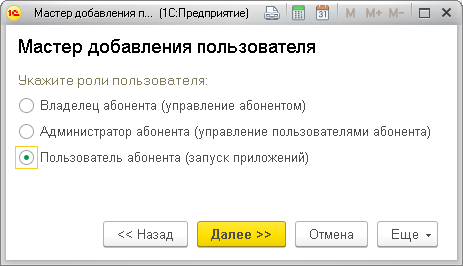 Если вы выполняете добавление пользователя в 1С как владелец учетной записи, система предложит назначить роль нового сотрудника. Выберите подходящую роль и продолжите, нажав «Далее». Администраторы абонента пропускают этот этап — по умолчанию новому аккаунту присваиваются стандартные права пользователя.