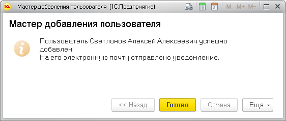 После настройки привилегий нажмите «Далее» для завершения процедуры. Система уведомит об успешном добавлении аккаунта.