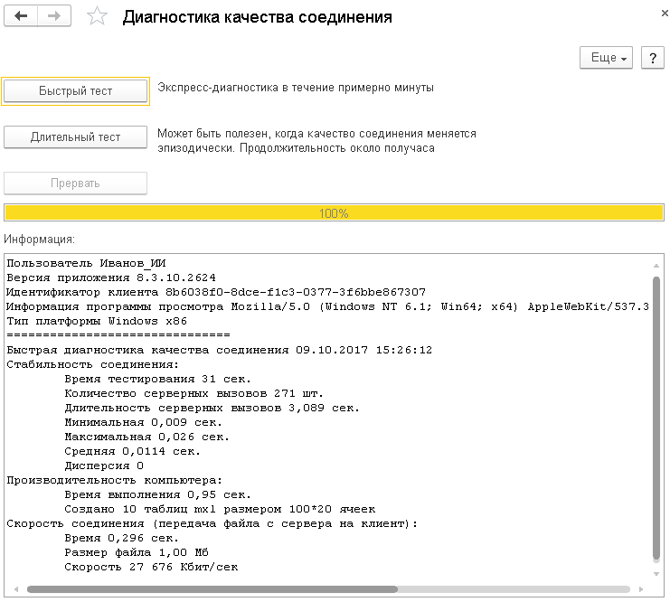 По итогам тестирования система выдаст результаты с полученными измерениями производительности компьютера, скорости и стабильности соединения. Считается, что для нормальной работы 1С:Фреш необходима скорость не менее 10 Мбит/с.