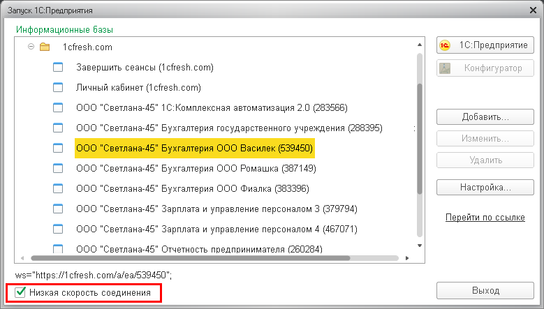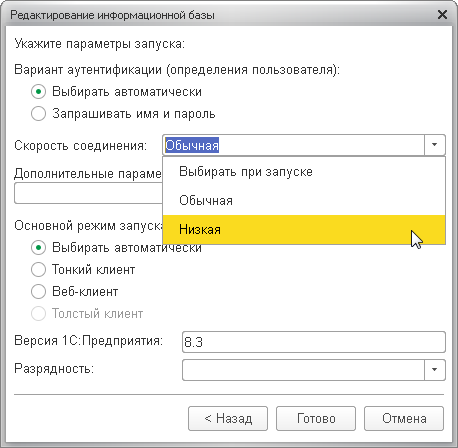 Если флажок отмечен серым и его нельзя установить, тогда после выбора базы нажмите Изменить, в окне редактирования кнопкой Далее перейти к следующему, в поле Скорость соединения выбрать Низкая – и подтвердить Готово.