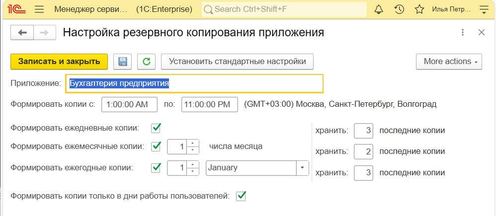 В какое время будут формироваться копии – выбирайте период, когда пользователи не работают в приложении. Обычно это ночные часы – если среди ваших сотрудников есть люди из других часовых поясов, обсудите с ними заранее, что в определенное время необходимо выйти из программы.