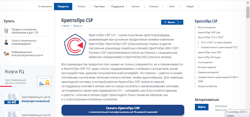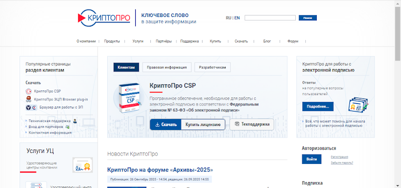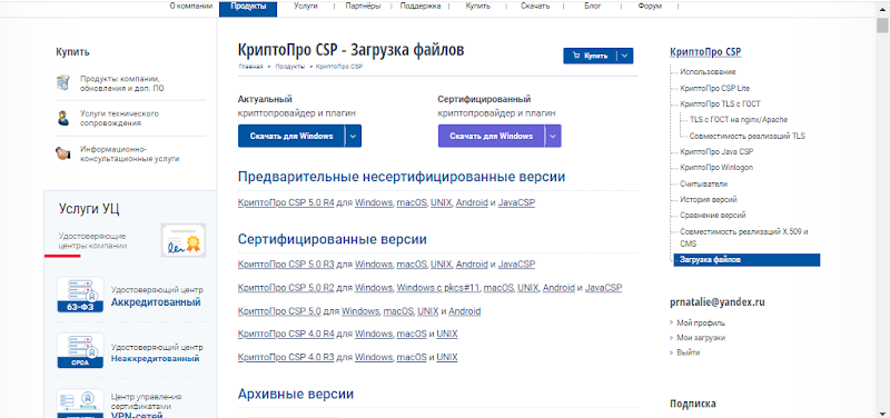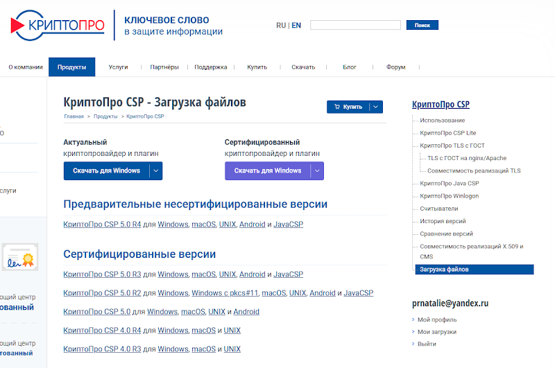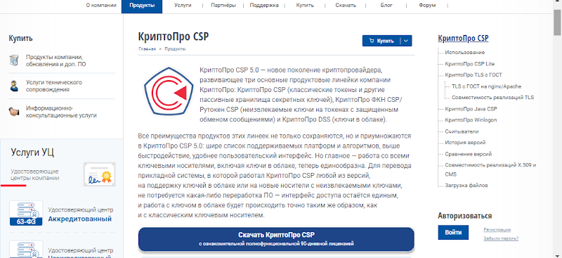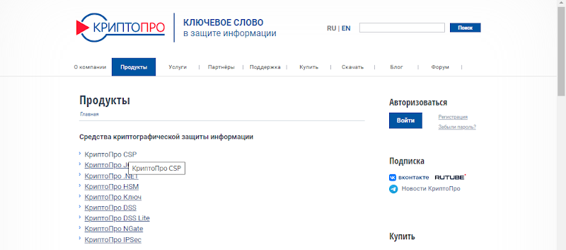 Сначала необходимо на сайте разработчика https://cryptopro.ru/ найти в меню Продукты и скачать файлы для установки: