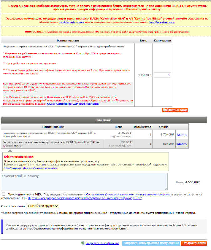 При нажатии на Купить выдаст таблицу – здесь можно указать количество лицензий (сколько человек от организации будут использовать ЭП), которые вы хотите добавить в заказ, проверить его состав, способ доставки и другие параметры. И подтвердить: