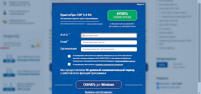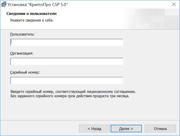 И ввести данные о пользователе и серийном номере криптопровайдера (можно позже, но без номера программа работает в тестовом режиме 90 дней).