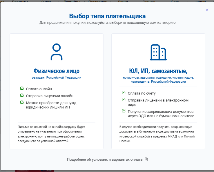 Когда по истечении бесплатного периода вы решите купить лицензию, система предложит указать тип плательщика: