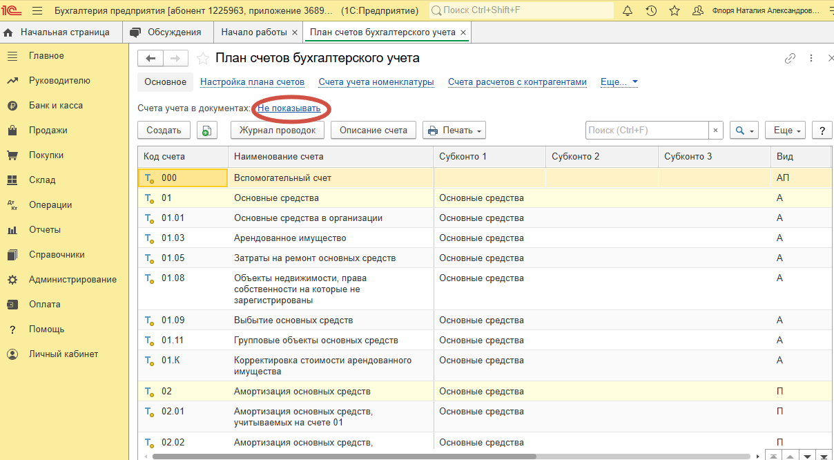 - На странице плана счетов обратите внимание на информационное поле с названием «Счета учета в документах». Рядом с ним находится кликабельная ссылка, которая будет отображать текущий статус: «Показывать» или «Не показывать».