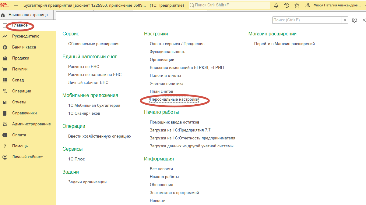 - Также в разделе «Главное» найдите и откройте пункт «Персональные настройки». Эта форма содержит параметры, которые могут быть индивидуальны для каждого пользователя программы.
