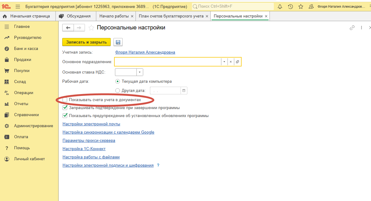 - В открывшемся окне найдите параметр «Показывать счета учета в документах». Он представлен в виде чекбокса (флажка).