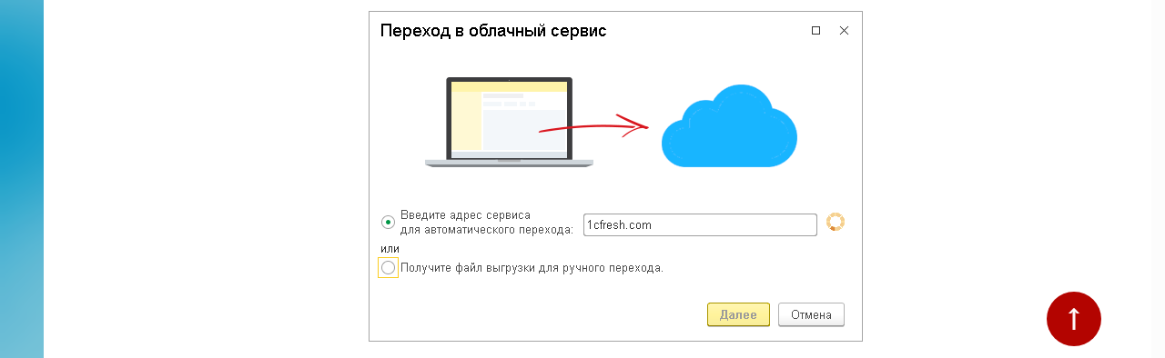 - Ввод адреса сервиса: Укажите адрес облачного сервиса, например, 1cfresh.com. Система автоматически проверит его корректность (появится зеленая галочка), после чего нажмите Далее.