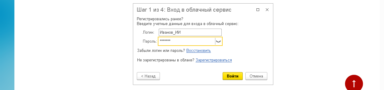 - Авторизация: В следующем окне необходимо ввести логин и пароль вашей учетной записи в сервисе 1С Фреш. Если вы еще не зарегистрированы, используйте ссылку Зарегистрироваться в этом же окне.
