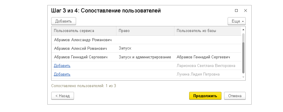 - Сопоставление: Мастер отобразит список пользователей вашей текущей «коробочной» базы. Вам нужно для каждого из них указать соответствующего пользователя сервиса 1С Фреш.