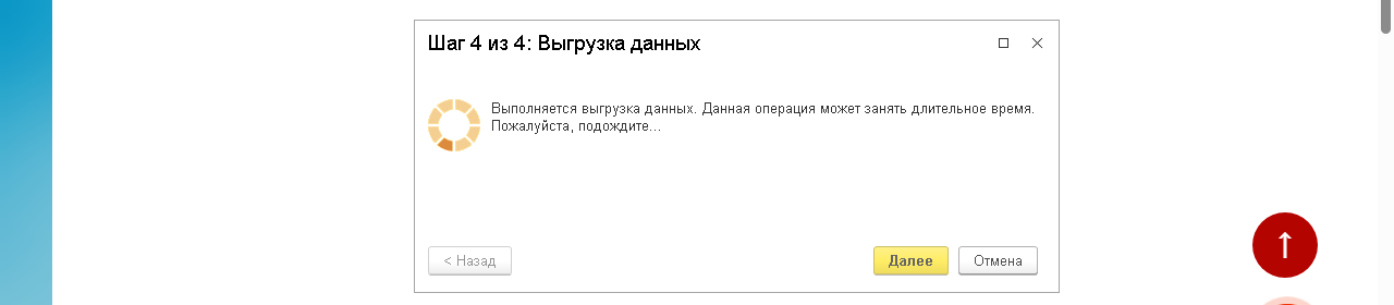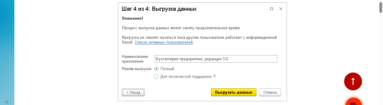 - Запуск выгрузки: Нажмите кнопку Выгрузить данные. Процесс может занять длительное время в зависимости от объема базы.