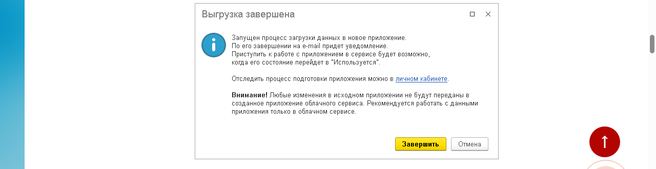 - Завершение: После успешной выгрузки нажмите Завершить. Мастер автоматически начнет процесс загрузки данных в созданное в вашем личном кабинете приложение. Дальнейший ход операции можно отслеживать уже в интерфейсе сервиса 1С Фреш.