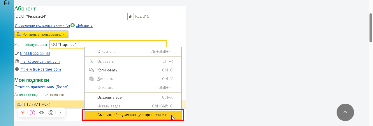 - Начало процедуры. Используя правую кнопку мыши, выберете наименование текущего сервисного партнера. Он указан рядом с подписью «Вас обслуживает».