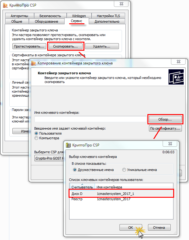 На вкладке Сервис нажмите Скопировать, в открывшемся окне — Обзор, система выдаст список всех контейнеров, которые найдет на всех доступных носителях. Выделите нужный и подтвердите ОК.