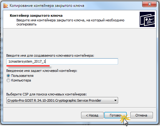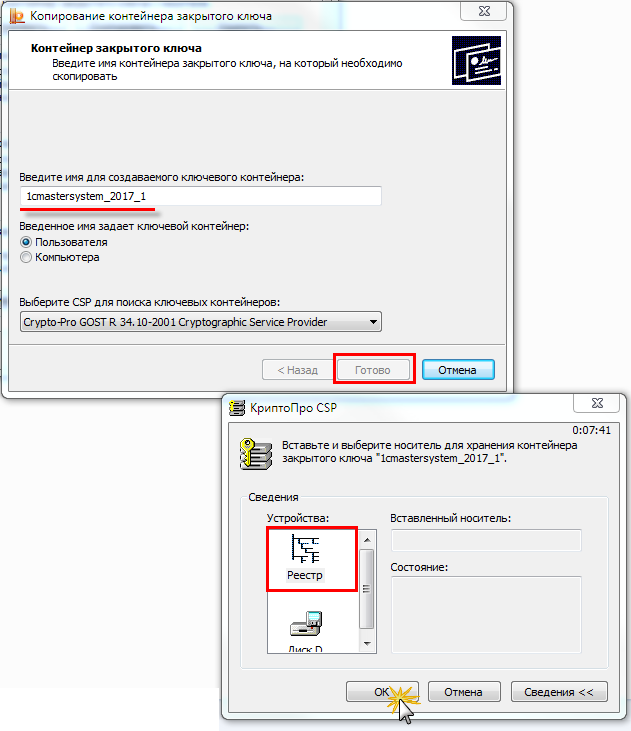 На следующем шаге можно изменить имя контейнера или оставить то же. Подтвердите действие нажатием Готово. Дальше нужно выбрать место для хранения ключа — отметьте в качестве устройства Реестр и нажмите Ок.