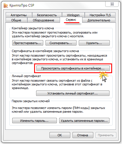 Теперь, когда контейнер скопирован, нужно установить сертификат в хранилище. Для этого откройте КриптоПро CSP и на вкладке Сервис кликните ссылку Просмотреть сертификаты в контейнере.