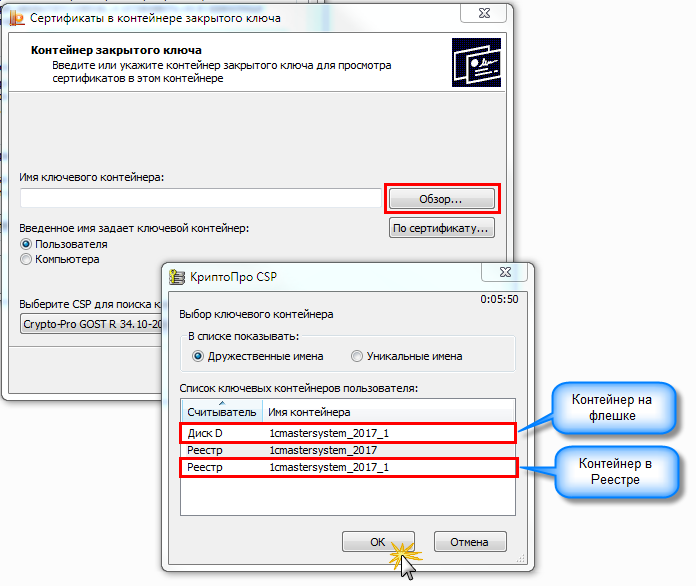 В открывшемся окне нажмите Обзор и выберите имя скопированного контейнера. Если выполнено копирование, в колонке Считыватель у него будет указано Реестр, если нет, отразится название флешки.