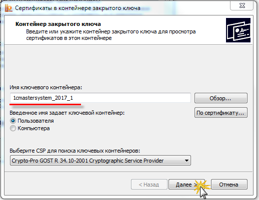 В новом окне нажмите Обзор около строки Имя ключевого контейнера — если контейнер не один, переключите показ на Уникальные имена, и найдите нужное. Подтвердите нажатием ОК.