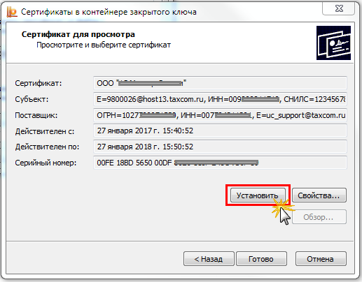 В новом окне будут выведены параметры сертификата — проверьте их, чтобы убедиться, что вы скопировали нужный сертификат, и нажмите Установить.