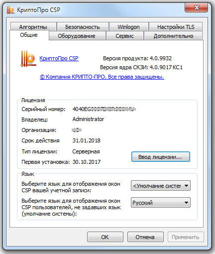 Откроется окно криптопровайдера — кликните на вкладку Сервис.