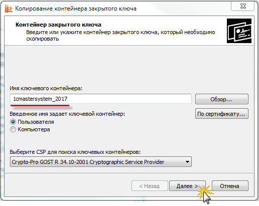 Система вернется к предыдущему окну, при этом в строке имени контейнера отразится выбранное вами. Перейдите на следующий шаг, нажав Далее.
