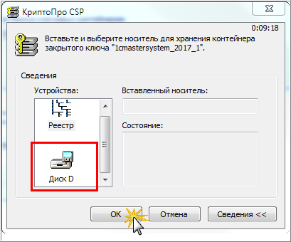Вставьте носитель — токен, куда скопируете контейнер. Можно использовать и обычную флешку — хранить на носителях без защиты ключи нежелательно, но для перемещения (с последующим удалением с незащищенного носителя) это возможно. Отметьте его среди предлагаемых устройств, подтвердите действие ОК.