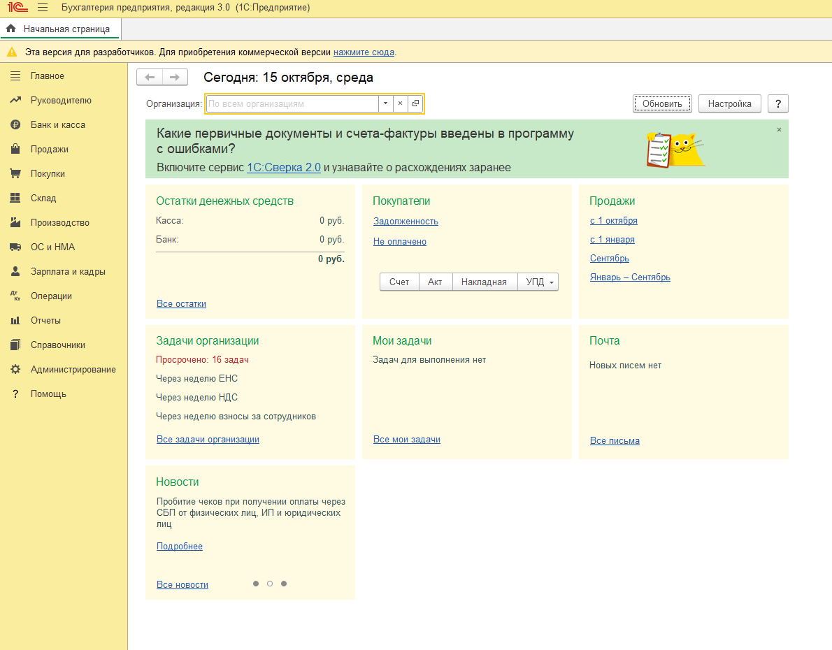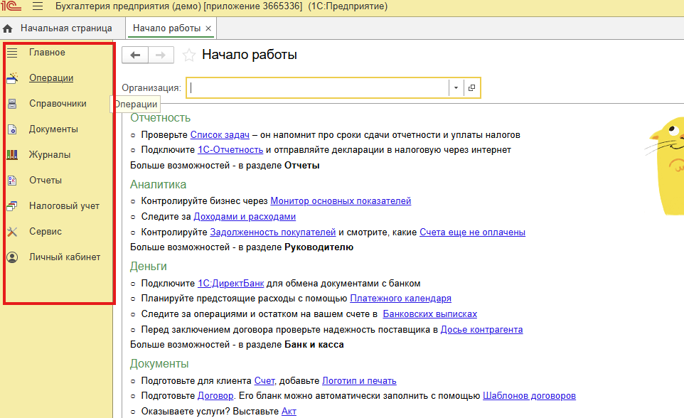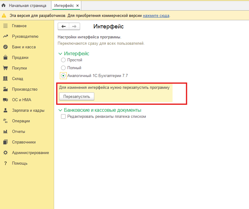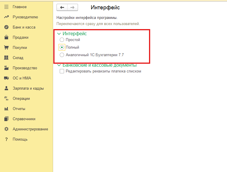 Аналогичный 1С:Бухгалтерия 7.7 – для тех, кто привык пользоваться предыдущей версией, переход на новую может даваться непросто. Поэтому в 8.3 предусмотрена возможность установить интерфейс, каким он был в 7.7 – с такими же разделами меню и распределением в них команд. А функционал такой же, как в Полном интерфейсе.