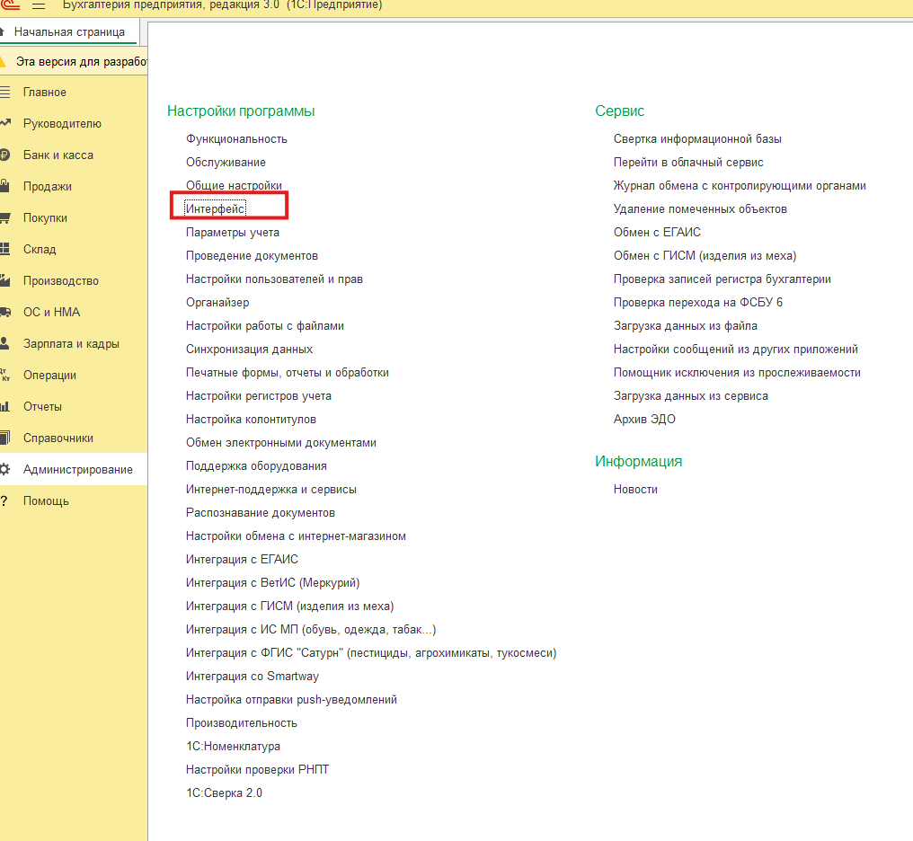 Откройте раздел Администрирование и там, в разделе Настройки программы, выберите Интерфейс.