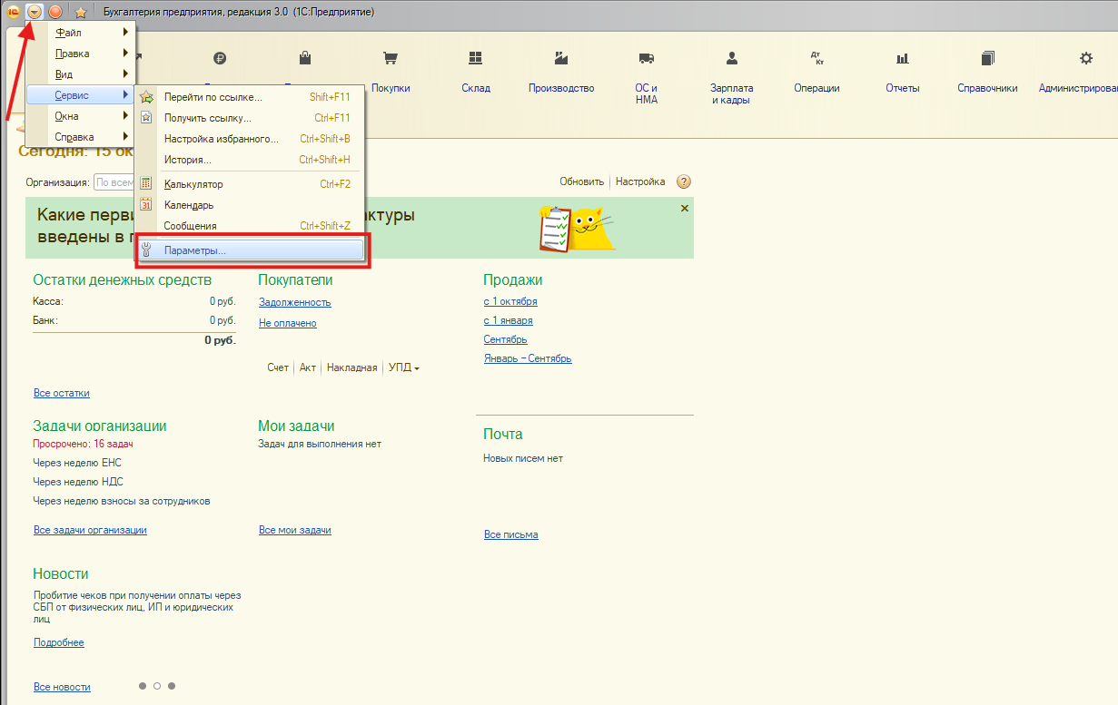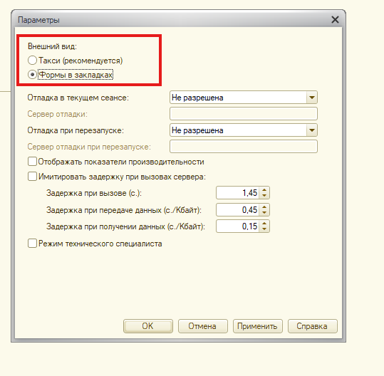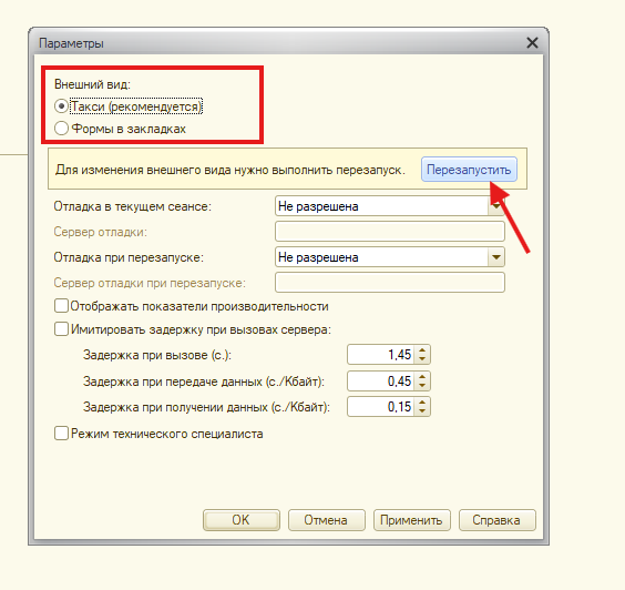 Чтобы поменять интерфейс, зайдите в пункт меню Сервис и настройки – он расположен в самом верху, на уровне названия программы, в Такси справа, в Формы в закладках слева. Там находим пункт Настройки, далее – Параметры.