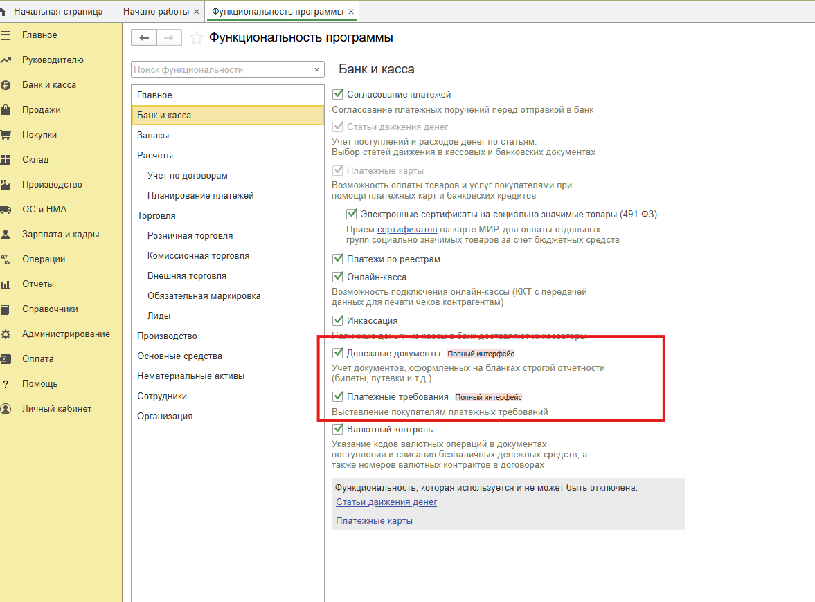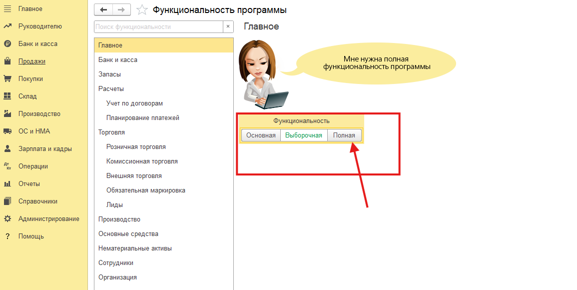 - Полный – стандартный вариант, в котором доступен полный функционал, а что будет входить в состав разделов, можно устанавливать самостоятельно, выбрав команду Функциональность в меню Главное в разделе Настройки.