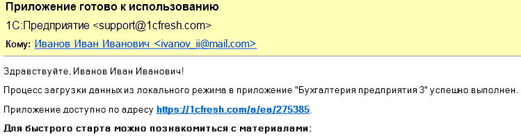 По окончании загрузки на электронный адрес пользователя придет письмо с уведомлением.
