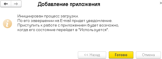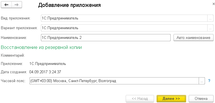 Введите наименование, под которым будет отражаться при запуске 1С восстановленное приложение, проверьте правильность определения часового пояса – и нажмите Далее. Система выведет сообщение, что процесс загрузки запущен. Он может занять длительное время, поэтому нажмите Готово – и ожидайте сообщения о завершении на электронную почту.