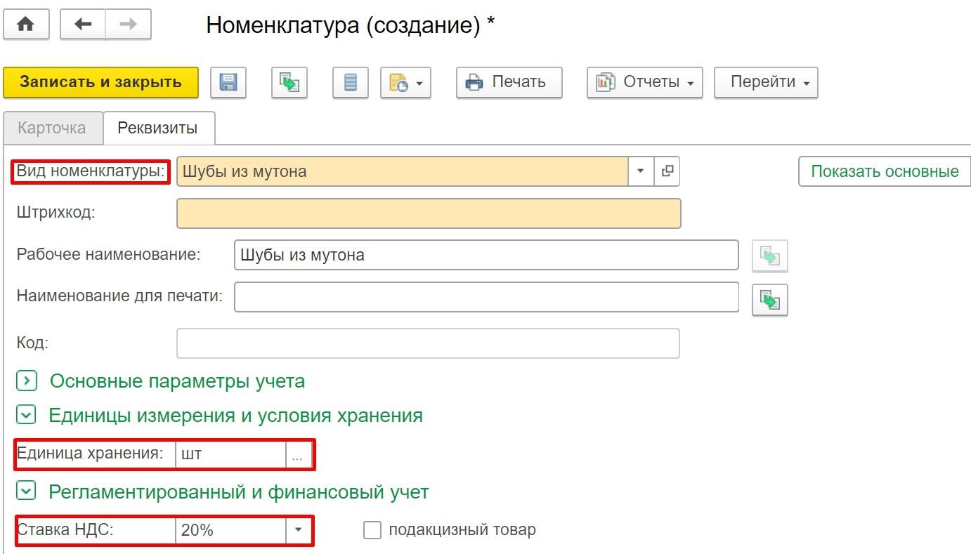 Откроется новая карточка – здесь заполните основные поля (наименование, артикул, единицы, ставка НДС и др.), если есть данные, то и дополнительные.