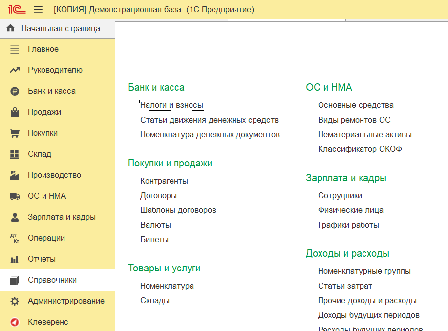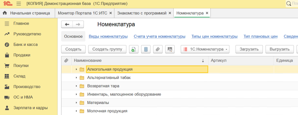 Если нужно добавить одну или несколько позиций, такой вариант удобнее, чем подготовка специального файла. Для этого зайдите в Справочники – и там в Номенклатуры. Поставьте курсор на нужную номенклатурную группу и нажмите Создать.