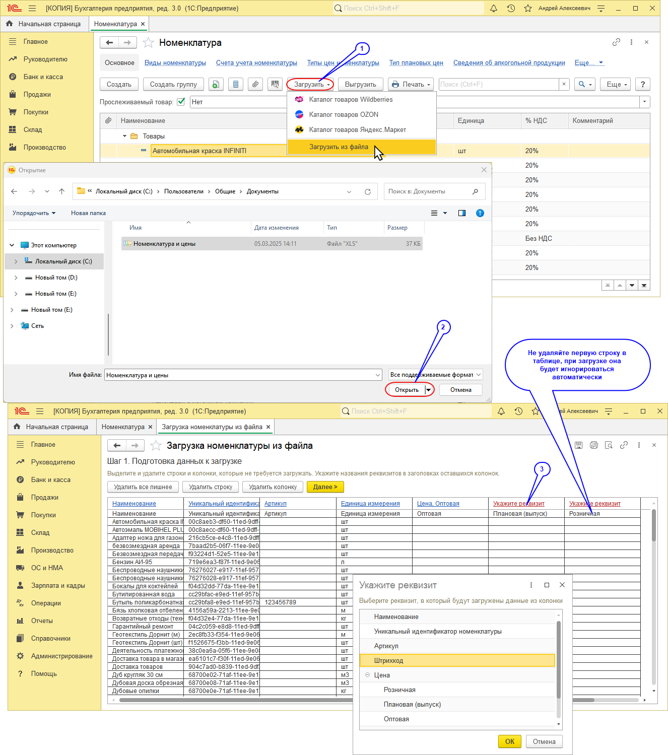 4. Первый шаг – сопоставление названий колонок в файле и реквизитов справочника. Если соответствие не найдено, система отметит такие столбцы красной гиперссылкой «Укажите реквизит» - при нажатии на нее появится список вариантов, можно указать нужный или удалить колонку, если она не нужна при загрузке. Строки, которые не требуется загружать в номенклатуру, также можно удалить – за исключением первой, с названиями столбцов, она в любом случае не перегружается.