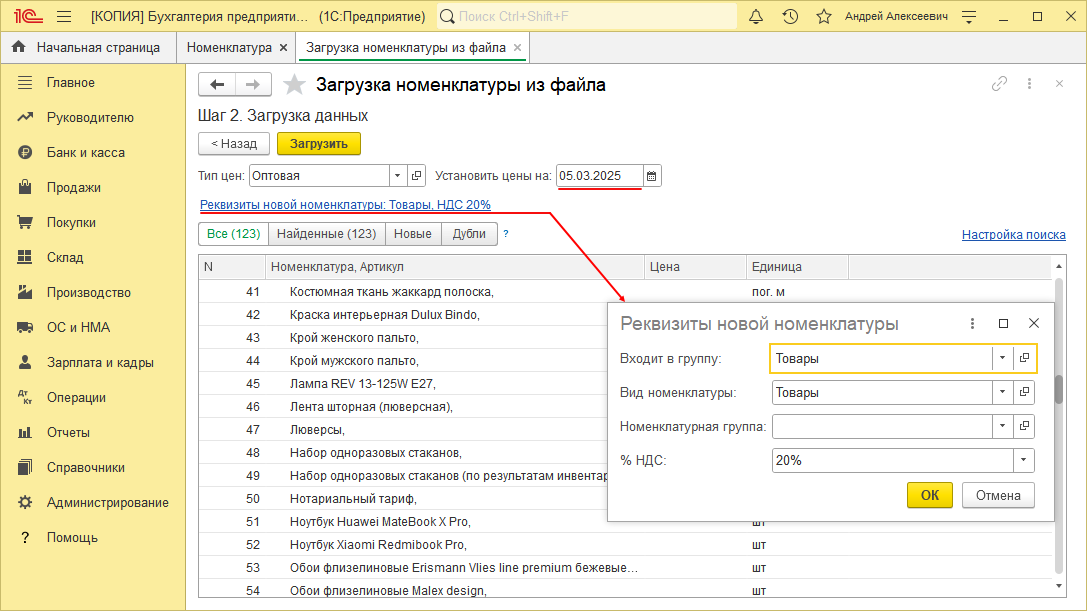 5. На втором шаге нужно перейти по ссылке Реквизиты новой номенклатуры – там указать папку для сохранения загружаемых позиций, вид номенклатуры, номенклатурную группу, ставку НДС. Важно! Если такая позиция уже есть, в другую группу она не загрузится. Проверьте, корректно ли указаны сведения в таблице – если нужно, доступно ручное редактирование, можно поставить другую дату.
