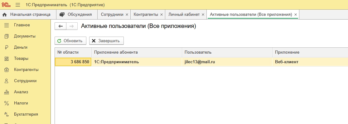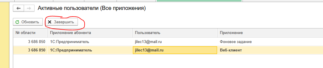 - в открывшемся списке будут отображены все текущие подключения к вашей информационной базе;